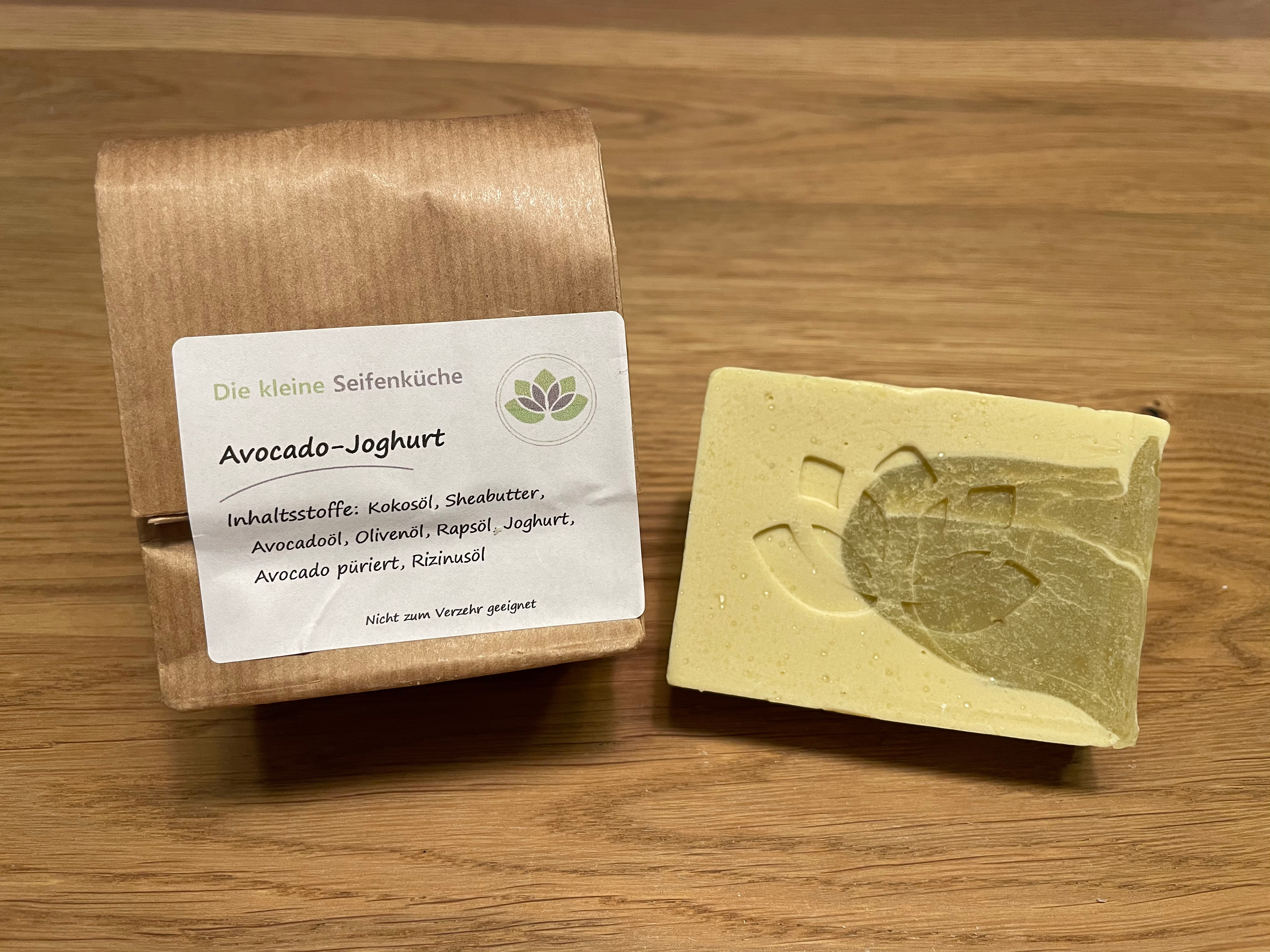 Kokosöl, Sheabutter, Wasser, Avocadoöl kaltgepresst , Olivenöl , Rapsöl, Natriumhydroxid (NaOH), Joghurt Griechisch Natur, Rizinusöl, Titan Dioxid, Avocado